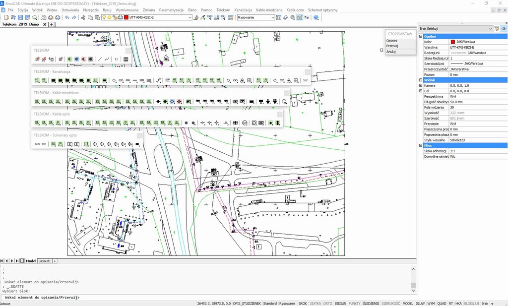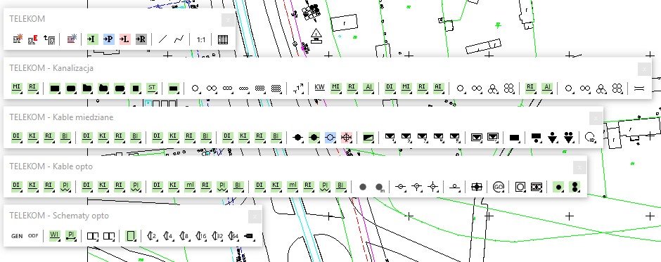 Telekom integruje się ze środowiskiem CAD dodając do niego swoje polecenia zgrupowane w menu górnym oraz toolbarach. Polecania nanoszenia sieci są intuicyjne, pozwalają się skupić na projektowaniu, a nie na poleceniach programu CAD. Telekom nie zmienia przy tym działania standardowych poleceń środowiska CAD.
