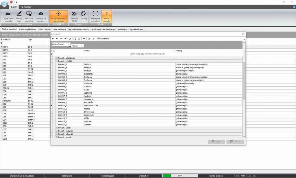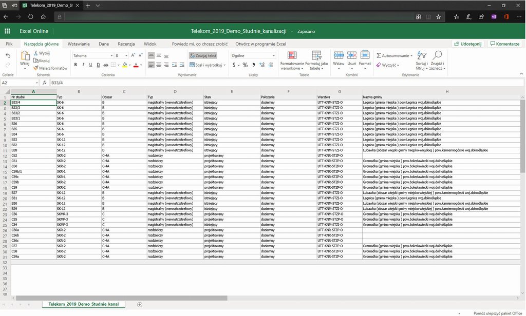 Moduł Zestawienia umożliwia przypisywanie informacji o gminach (na podstawie danych pozyskanych z systemu TERYT) do elementów sieci oraz wykonywanie zestawień obejmujące te dane.